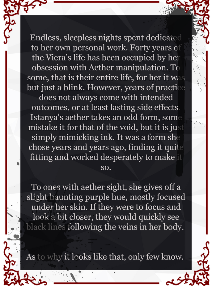 Thanks to Istanya's Aethersense, intimacy can be a challenge. Touch alone awakens her senses. She dresses in long coats and gloves for a reason, not wanting to feel the full emotion and element behind someone's aether just because she bumped shoulders.Once more of herself is uncovered, It can become extremely overstimulating depending on the person. She can't "turn it off", it is something she views as both a blessing and a curse.