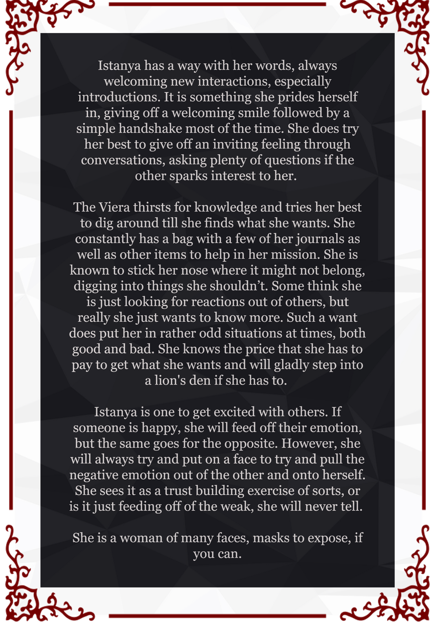Thanks to Istanya's Aethersense, intimacy can be a challenge. Touch alone awakens her senses. She dresses in long coats and gloves for a reason, not wanting to feel the full emotion and element behind someone's aether just because she bumped shoulders.Once more of herself is uncovered, It can become extremely overstimulating depending on the person. She can't "turn it off", it is something she views as both a blessing and a curse.